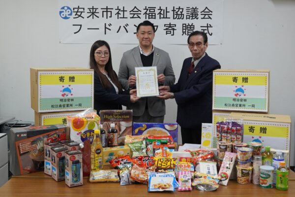 明治安田生命松江南営業所様より、昨年に続き食料品および生活用品をご寄贈いただきました。