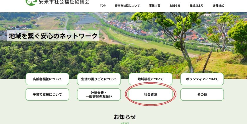ホームページのトップ画面、「社会資源」をクリックしていただくと、各地区のサロンや趣味の活動といった集いの場の情報や日常生活に役立つ情報が載っています。また、掲載希望の方、情報をお持ちの方は連絡を頂けると喜びます。